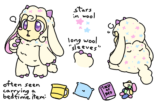 Since she's from a dream world, anything goes with her surroundings. Feel free to draw her with any kind of sleepy or dreamy vibes or areas!