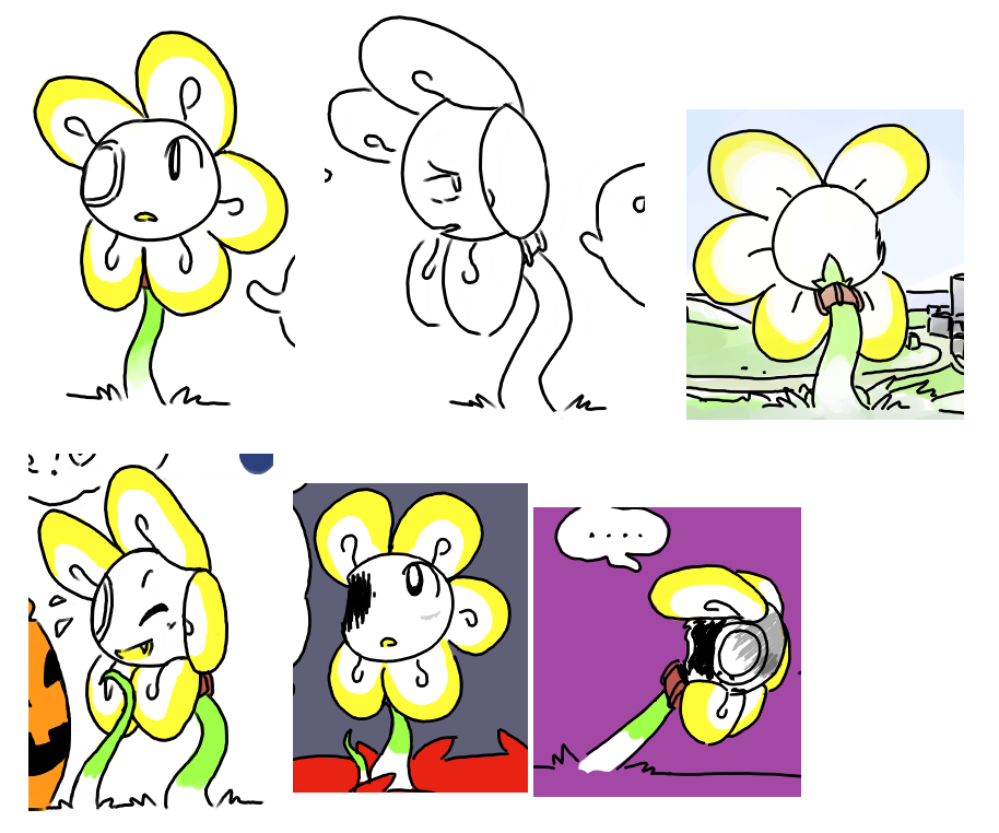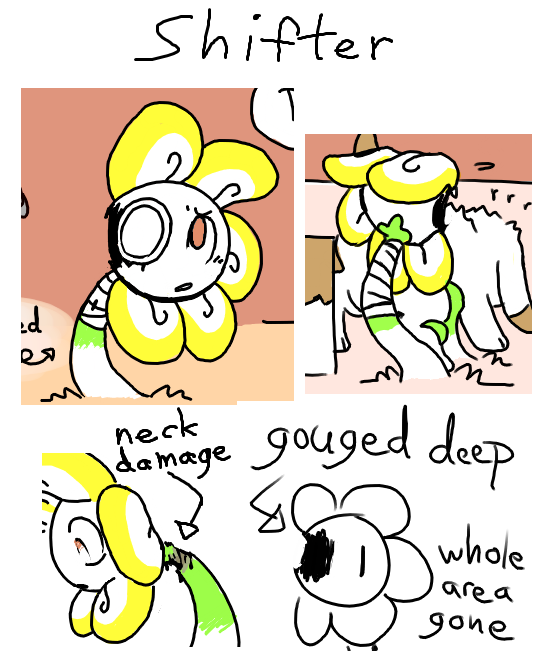 Thanks to compability issues he survived inside of Flowey’s mind, trapped and unable to move, where the askers eventually located him. Finding him scared and helpless, many decided to forgive him and aid him in any way they could. Flowey found out that people would enter his mind to interact with Shifter, however, and set an example by gouging out the right side of Shifter’s face and tearing off his rightmost petal. Shifter also started losing his mind due to hateful askers, and hallucinated Pointy talking to and harassing him for his actions.